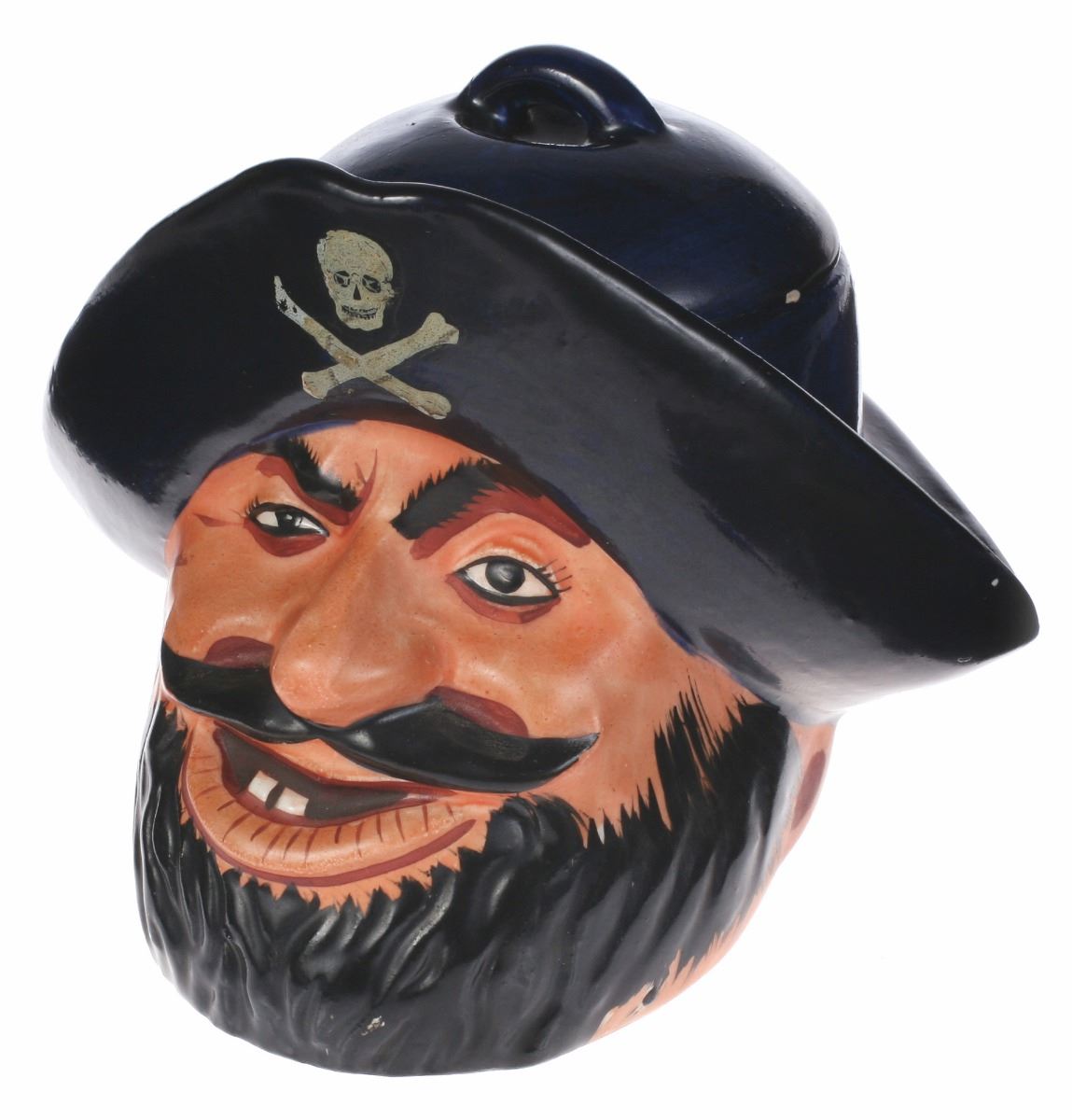 (Disneyland, 1960s) Ceramic pirate-shaped jar with removable top. Features a New Orleans Square decal on the base. Measures 4.5"x3.75" and 3.5" tall. In good condition with minor paint wear. Still retains the original Disneyland sales sticker under the lid.