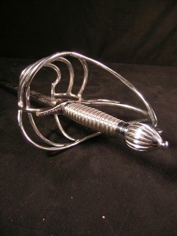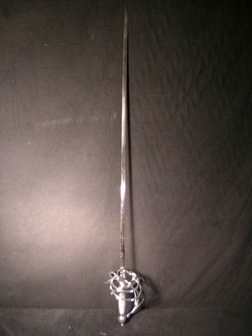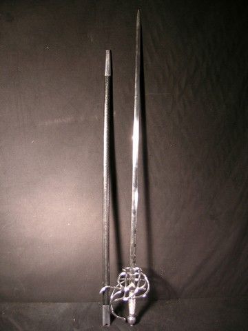 From 2003's 'Pirates of the Caribbean - Curse of the Black Pearl,' this is an exquisitely made prop sword from the background scene at the Castle. The sword blade is made from thin steel with a pointed tip. The handle is also steel and features an ornate design with a wide hand guard. The sheath is faux leather with a steel tip. A really cool, heavy duty prop that was made to last. (measures approx. 44 1/2" long). Oversized item. Additional postage required.