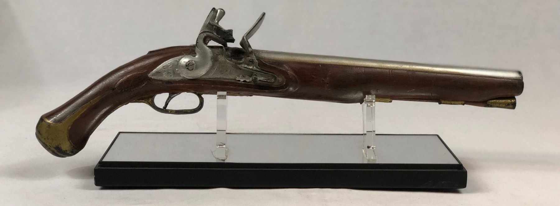 Original screen used rubber stunt flintlock pistol used in fantasy swashbuckler action film "Pirates of the Caribbean: The Curse of the Black Pearl" (2003), where Blacksmith Will Turner teams up with eccentric pirate "Captain" Jack Sparrow to save his love, the governor's daughter, from Jack's former pirate allies, who are now undead.