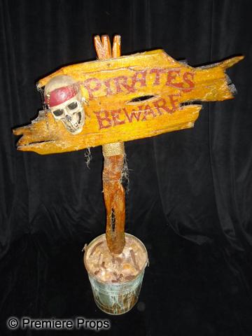 Pirates of the Caribbean: The Curse of the Black Pearl (2003) - A custom made "Pirates Beware" sign created by the art department at Disney for the film's premiere. Includes a three dimensional skull and cement filled decorated bucket. 36" x 44" x 13" . Oversized item. Additional shipping charges required.