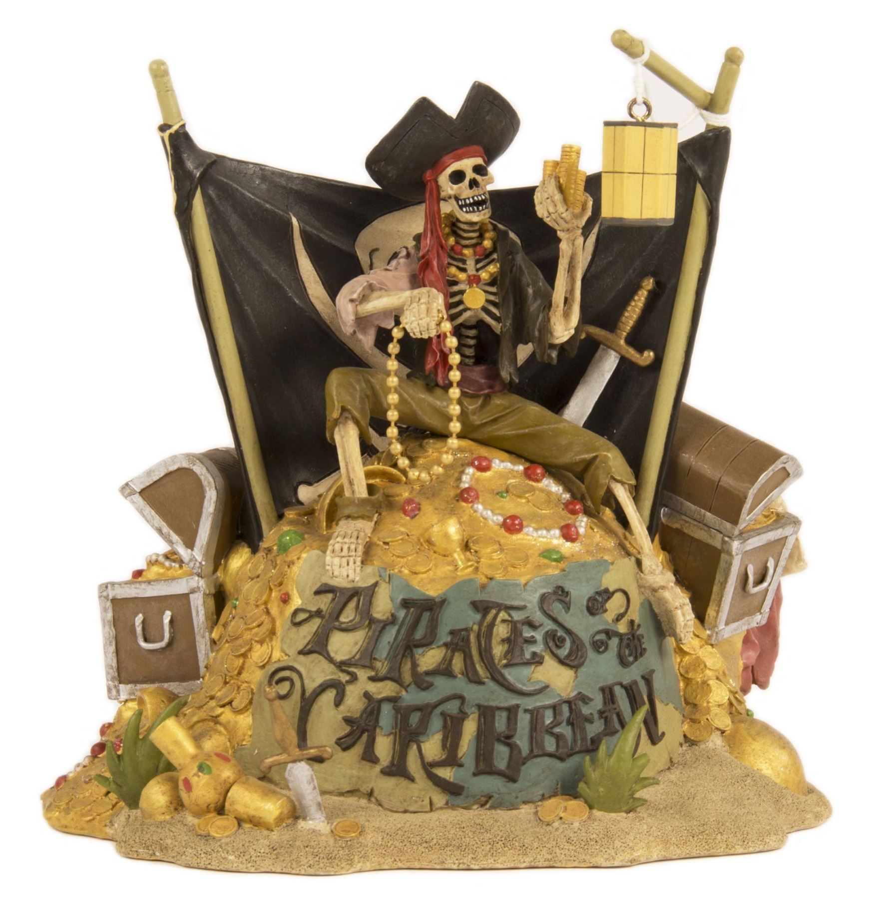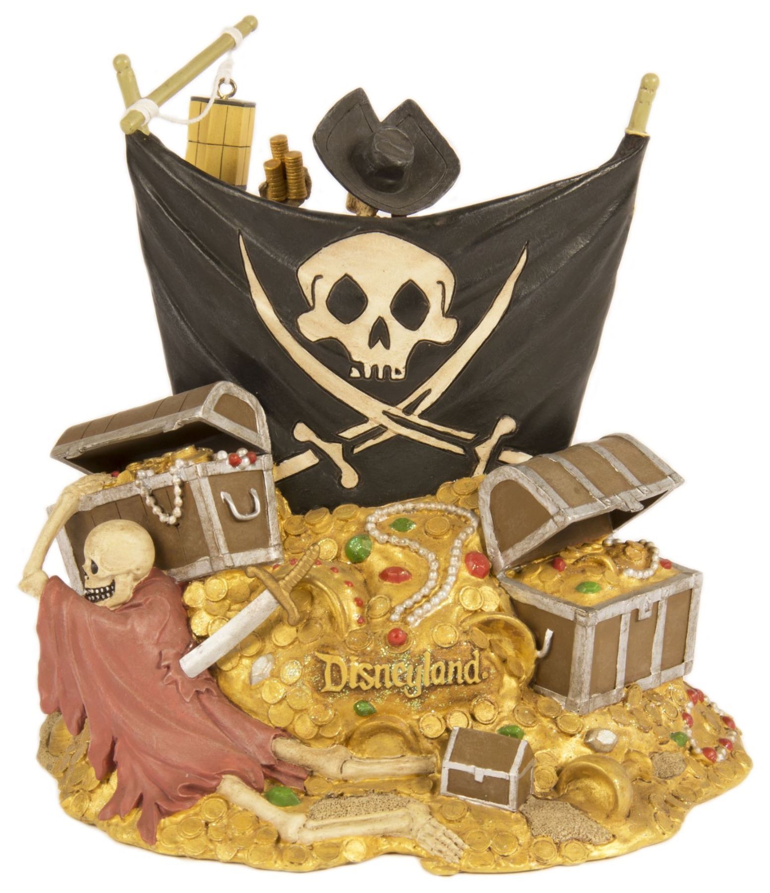 (Disneyland, 2003) A rare figure featuring the iconic skeleton sitting on a mound of treasure, from Disneyland's Pirates of the Caribbean. Offered in an edition of only 500 at a Pirates of the Caribbean event on July 9, 2003, the resin figure measures 6.5" tall and comes in its original box and packaging. The condition is very good with minor wear.