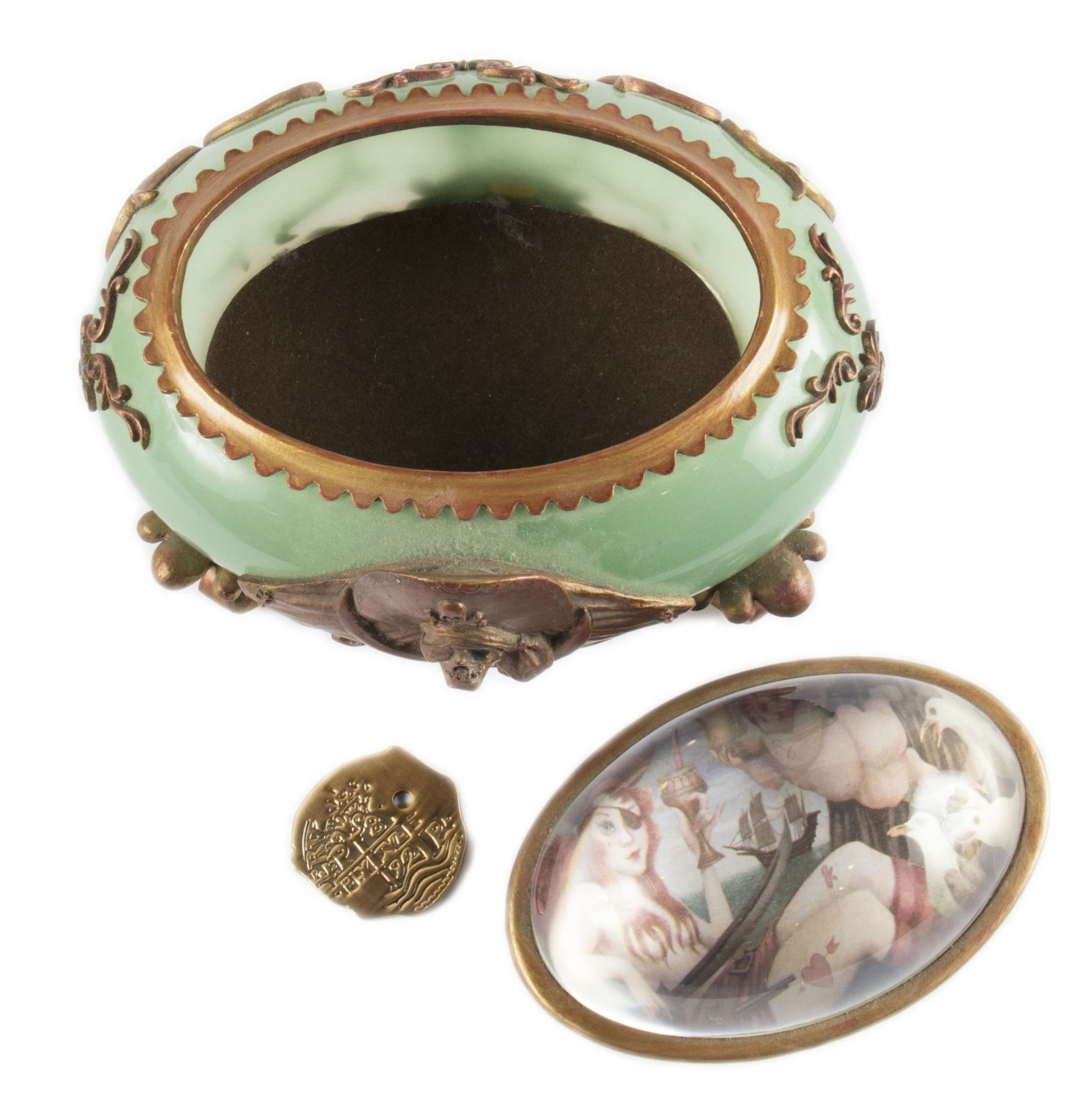(Disneyland, 2005) A trinket box created for Disneyland's 50th Anniversary that features imagery from the Pirates of the Caribbean attraction. A replica of an iconic painting seen within the attraction shows through the clear domed lid. This trinket box was part of a limited edition of 1000 and includes the souvenir doubloon that came with the box. Measuring 5"x6.75" and 6" deep, the box is in very good condition with some minor chipping to the paint.
