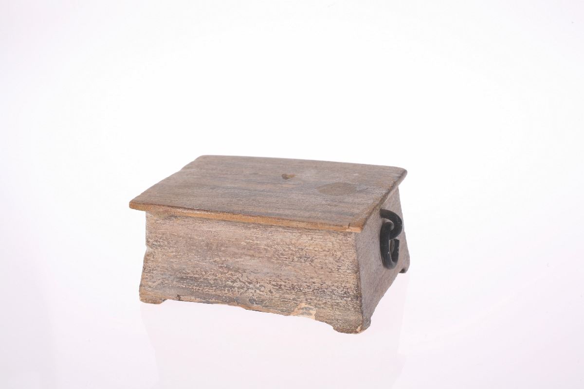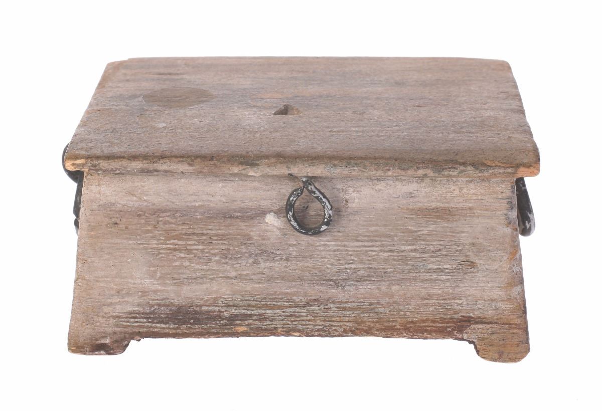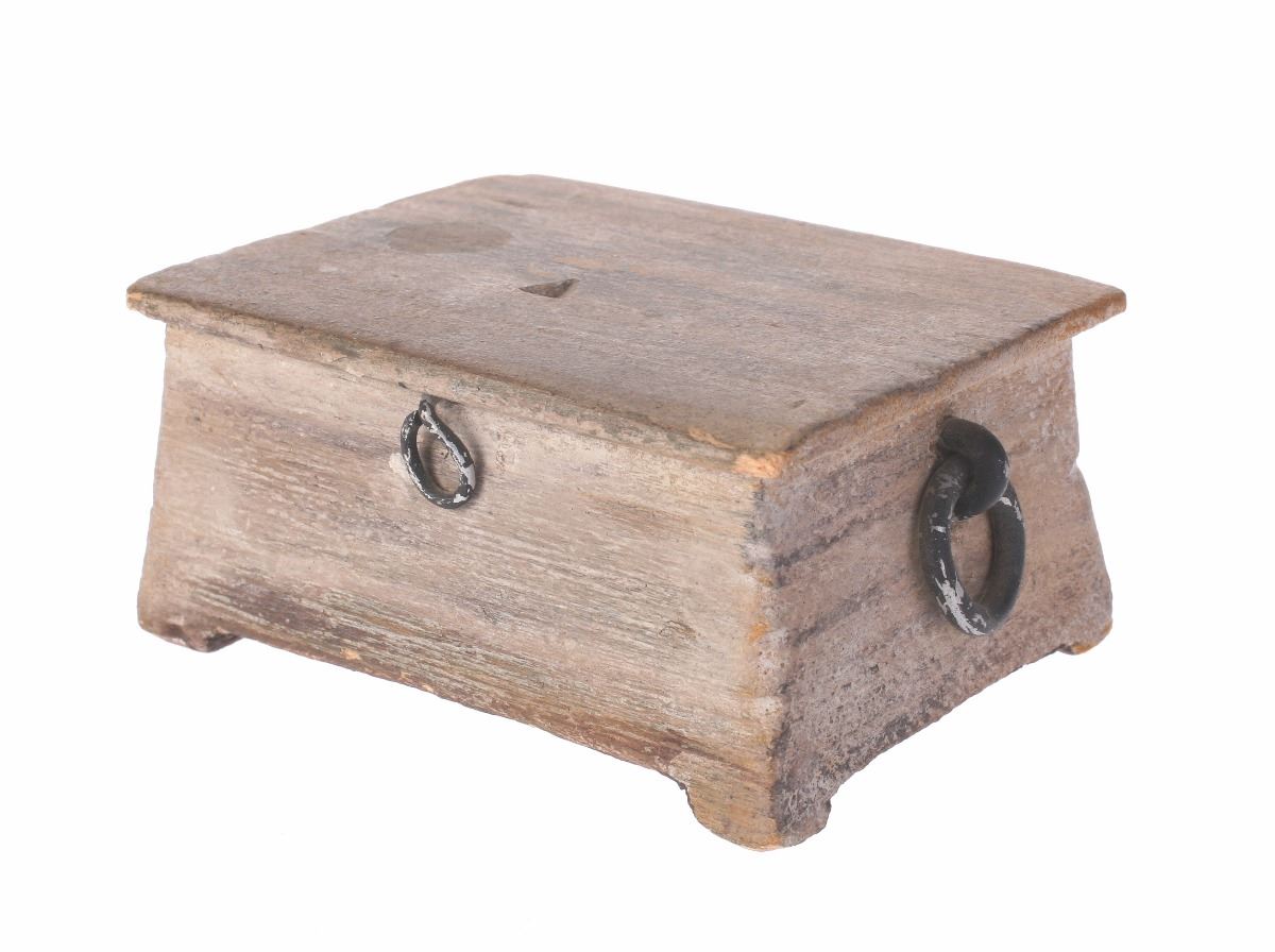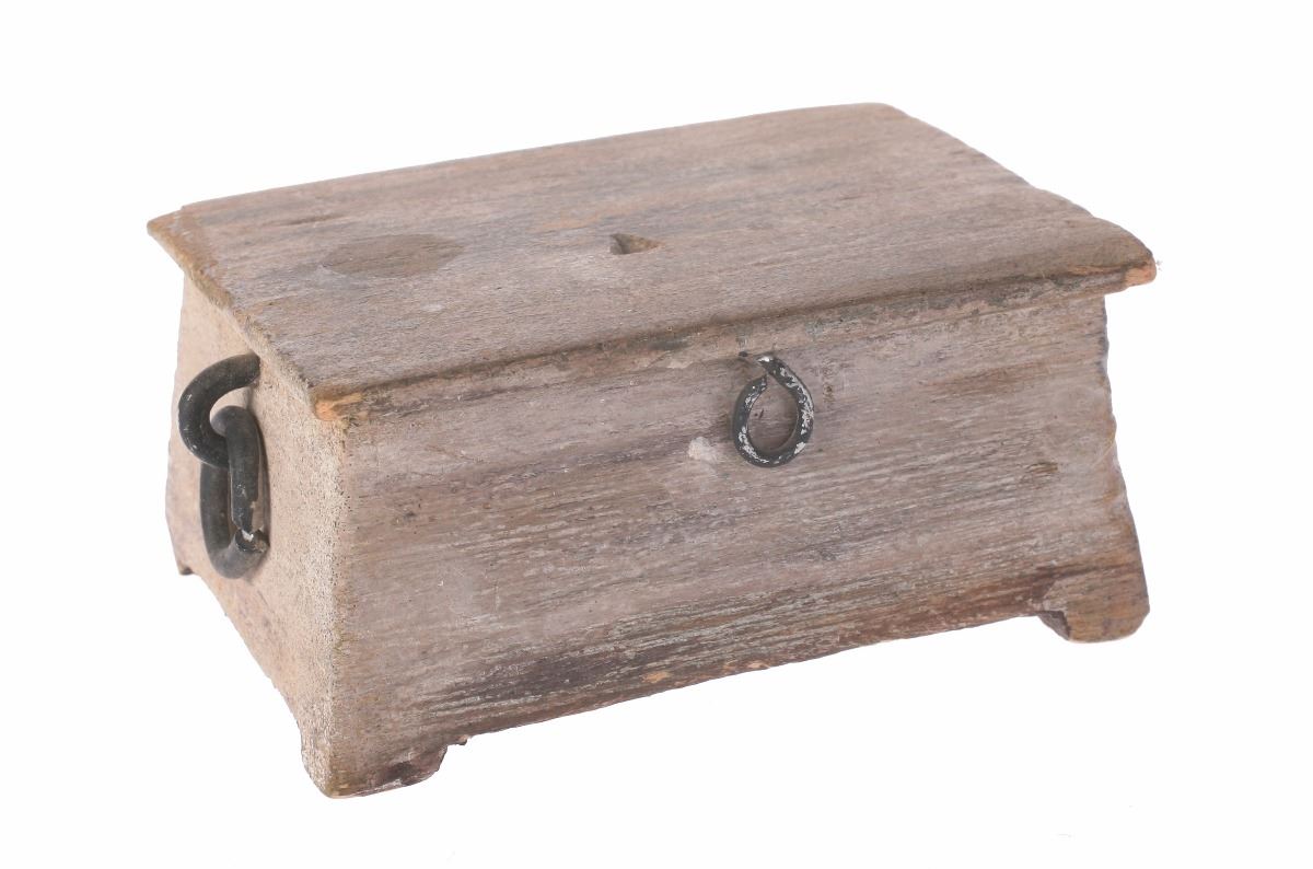 (Disneyland, 1967) Extremely rare wooden miniature chest used as part of the WED mock-up of the "Pirates of the Caribbean" attraction at Disneyland. This chest is one of the few pieces that has survived from the original concept model. Measures 3.5"x2.5" and 1.5" tall. In fine condition overall.