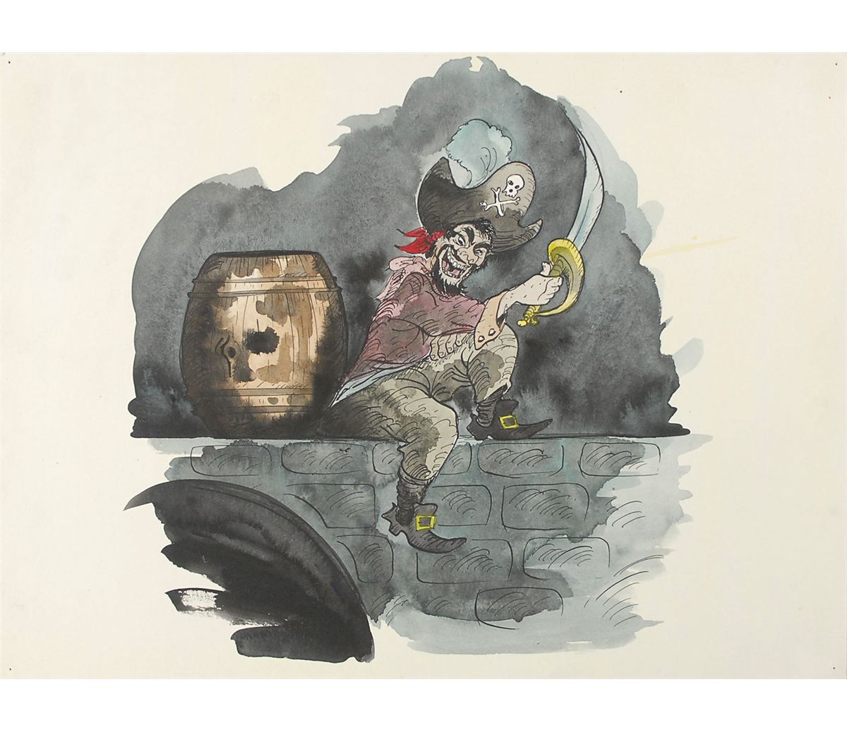Absolutely fabulous original concept art for Disney’s Pirates of the Caribbean attraction. The unsigned pen, ink, and watercolor artwork is on a 16 x 12 piece of artist’s board and features a pirate, with his cutlass raised, sitting atop of a bridge with his back to a barrel. In fine condition, with a single tack hole to each corner tip. A rare opportunity to obtain art for this classic Disney attraction, the last one personally supervised by Disney himself.