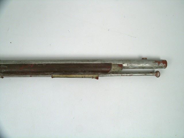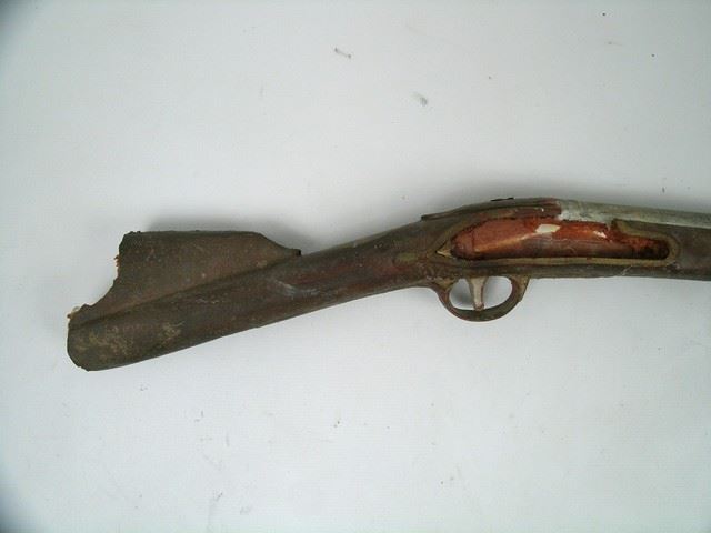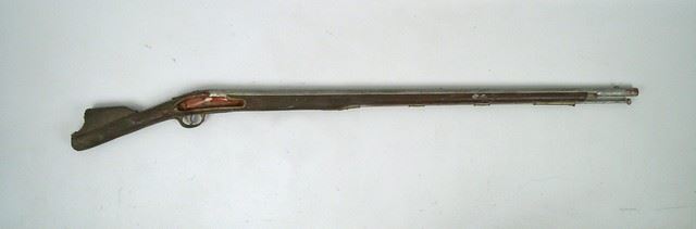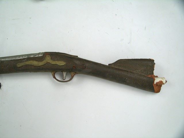 "Pirates of the Carribean: At World's End" heavily distressed foam rife prop with rigid core. Approx. 58" long, and 5" tall at base. Half of foam stock is missing. Empty trigger assembly area.
