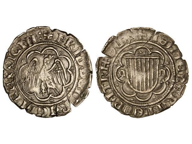 Pirral. FREDERIC IV. SICÍLIA. Anv.: ¶FRID DEI GRACIA REX SICILI:. Águila coronada con las alas extendidas. Rev.: ¶AC ATENARU:NEOPATRI+DUX:. A - A góticas a los lados de escudo coronado. (Grietas). MUY ESCASA. Cru.VS-615. MBC+/EB