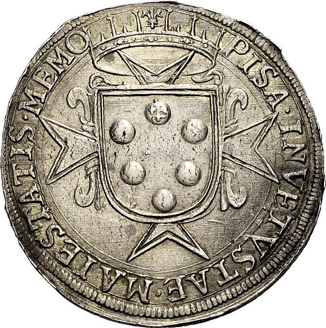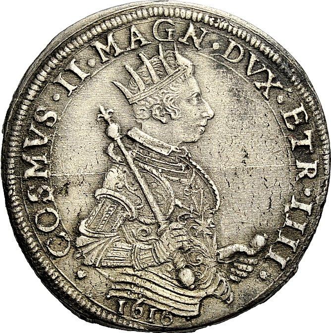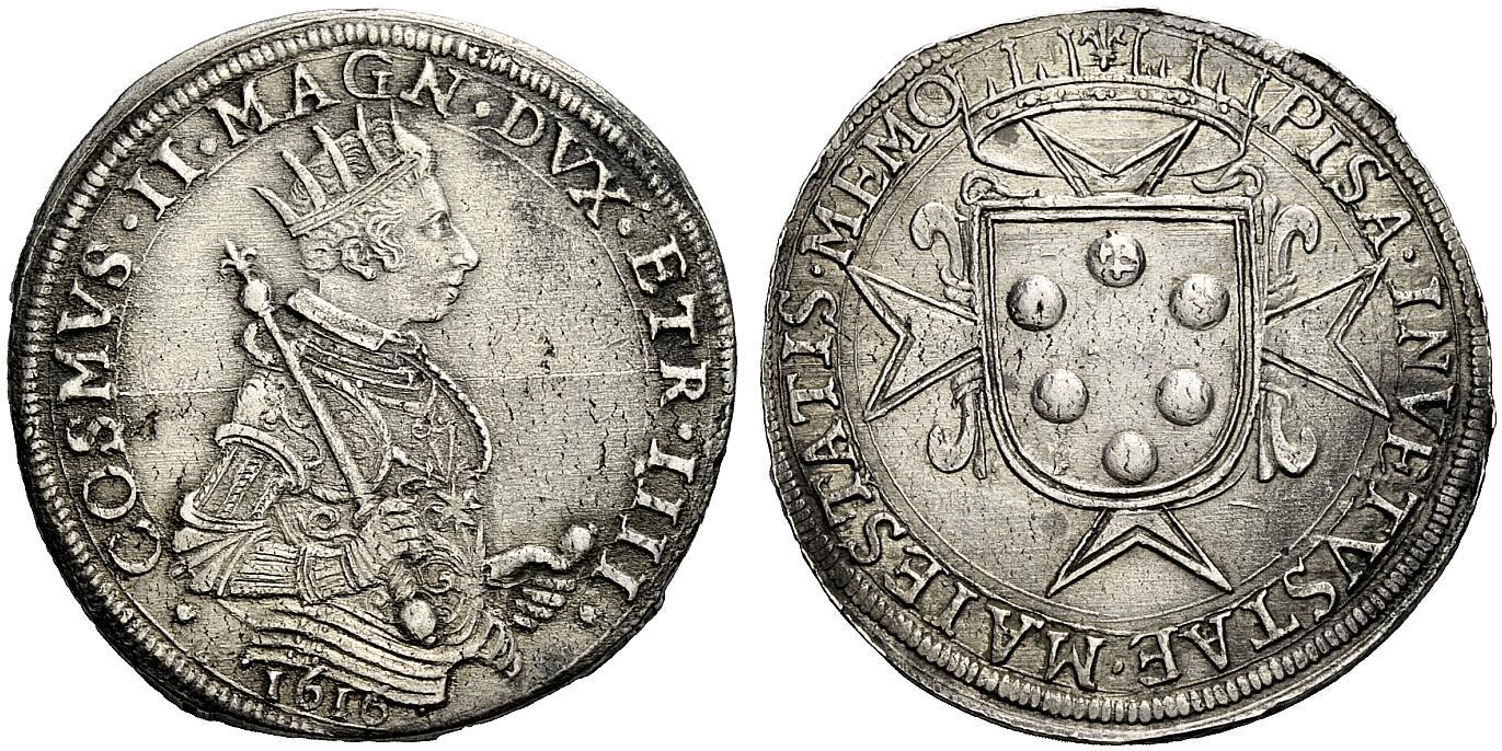 Pisa. Cosimo II de’Medici, 1609-1621. Tallero 1616, AR 28,80g. Mezza figura radiata del duca in armatura d. con lo scettro nella mano d. e la s. sull’elsa della spada; nel giro, sotto il taglio del busto, 1616. Rv. Stemma coronato caricato su croce di S. Stefano. CNI –. Galeotti XXXI/6. Di Giulio 71. Ravegnani-Morosini 14. Data molto rara. Leggera patina, ottimo BB