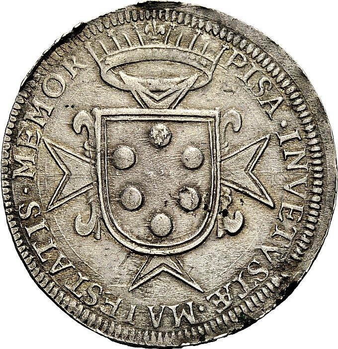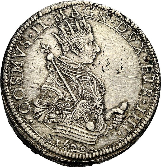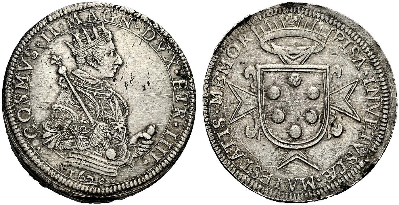 Pisa. Cosimo II de’Medici, 1609-1621. Tallero 1620, AR 28,40g. Mezza figura radiata del duca in armatura d. con lo scettro nella mano d. e la s. sull’elsa della spada; nel giro, sotto il taglio del busto, 1620. Rv. Stemma coronato caricato su croce di S. Stefano. CNI 15-22. Galeotti XXXI/25. Di Giulio 74. Ravegnani-Morosini 14. q.Spl