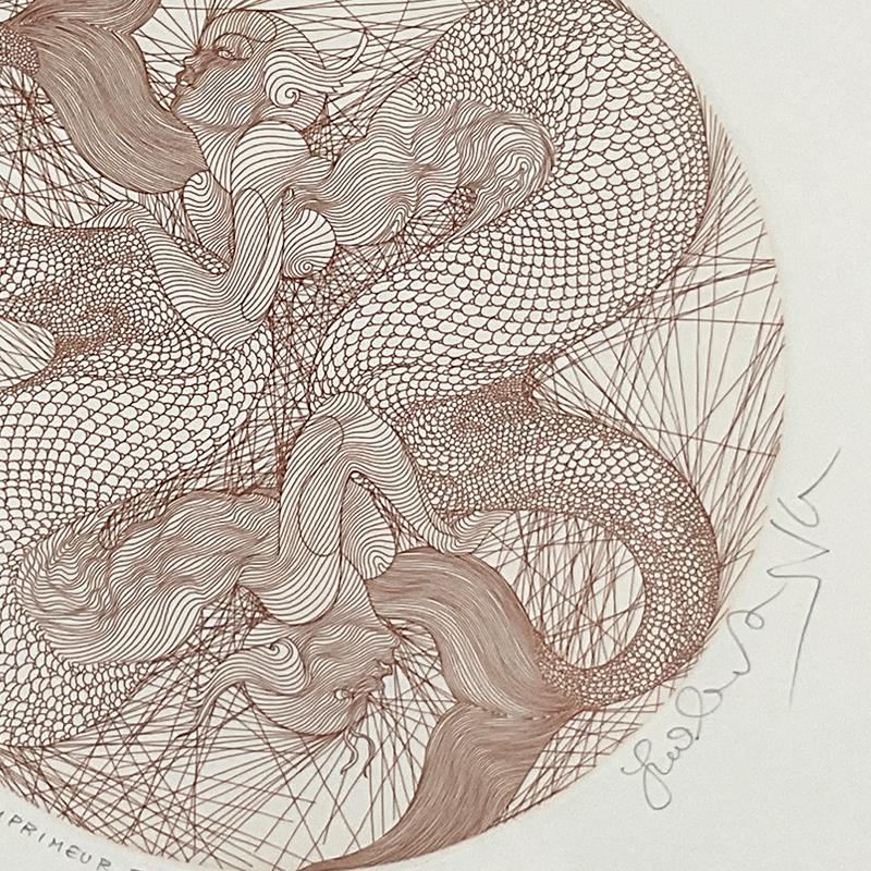 "Pisces" is a limited edition etching on paper by Guillaume Azoulay, numbered II/II and hand signed by the artist. This piece comes custom framed. Includes Letter of Authenticity. Measures approx. 18" x 18" (frame), 9" (image-diameter).