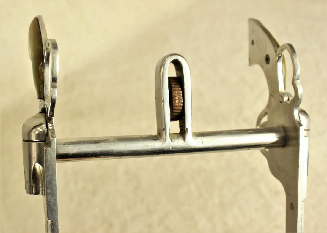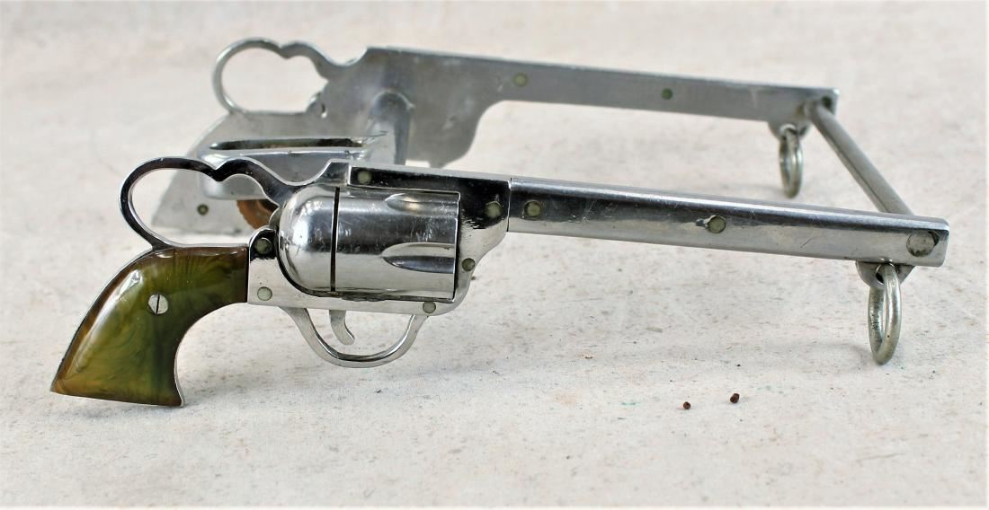 Three dimensional nickel plated halfbreed bit in the shape of Colt single action pistol with decorative green grips.
