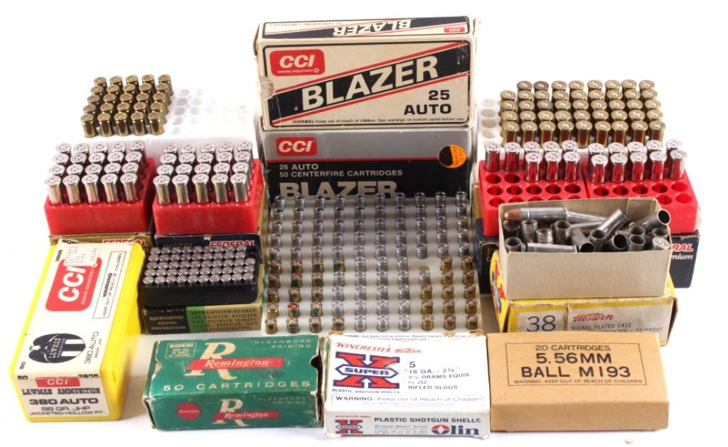 This includes: 25 rounds of PMC 30 Carbine 110gr FMJ, 44 rounds of .38 Special WCC 88 125gr, 99 rounds of CCI Blazer 25 Auto 50gr FMJ, 58 rounds of Federal Premium .38 Special (+P) 129gr Hydra-Shok Jacketed Hollow Points, 48 rounds of Dynamit Nobel German .22 short, partial brass and live rounds of Western .38 Special. There also empty boxes of CCI .380 auto, Remington .380 auto, 5.56mm Ball M193, and Winchester 16ga. All selling together as a collection.
