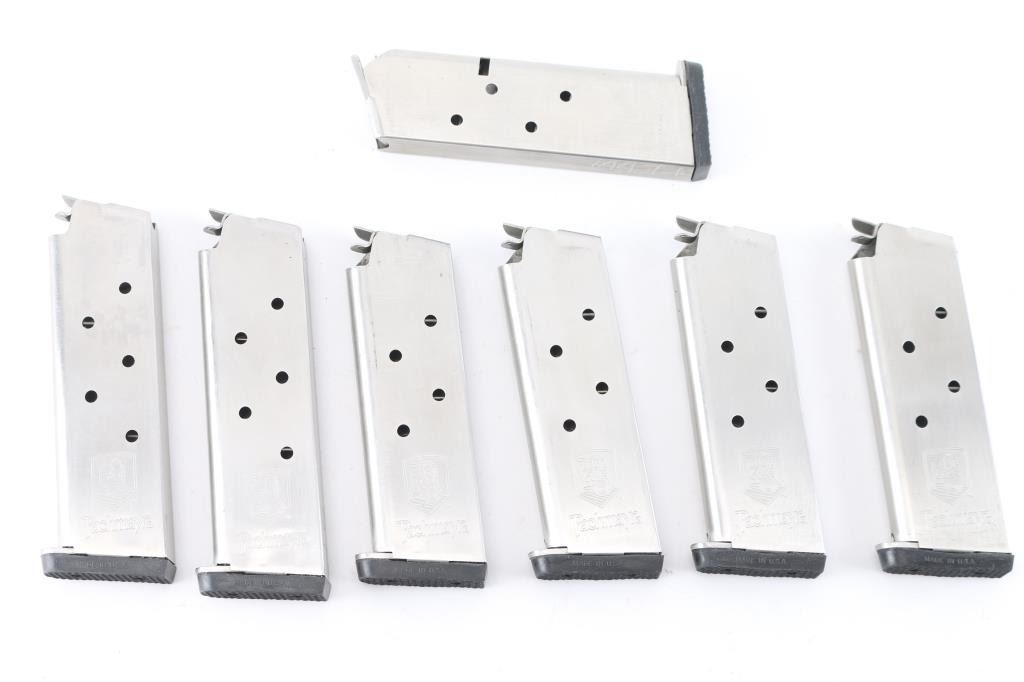 Total of seven. 5 - Pachmayr 6rd steel & 2 - 7rd steel magazines w/ rubber butt pads. All in very good condition.