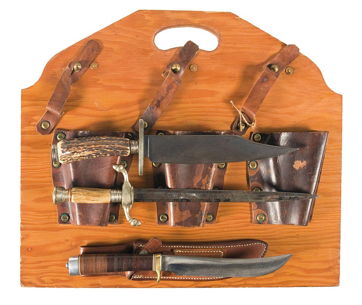 Pistol rack for 6 Colt Model 1911A1 pistols (very good), Randall knife (7" blade) with sheath (very fine), G.C. Co. dagger with stag grip (10" blade, good with minor pitting), Parkin & Marshall bowie knife with stag grip (very good, scattered mild pitting).