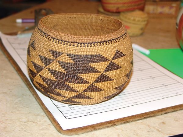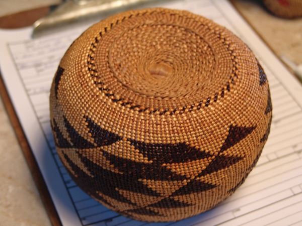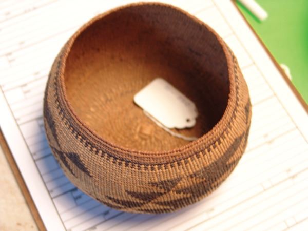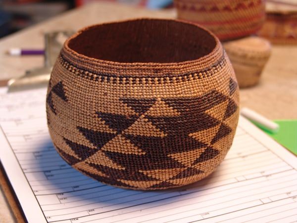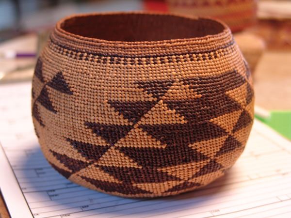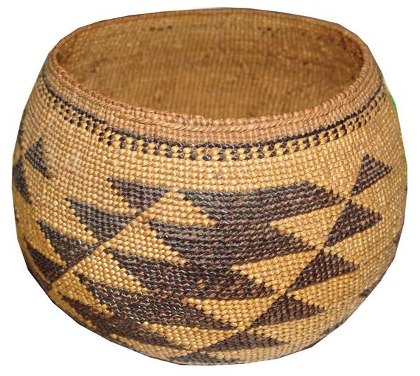 Early 1900s 4" x 6" Classic, rounded, fine weave twined basketry bowl with stacked rhomboid design. Very good condition. Ex. Mark Wald collection.