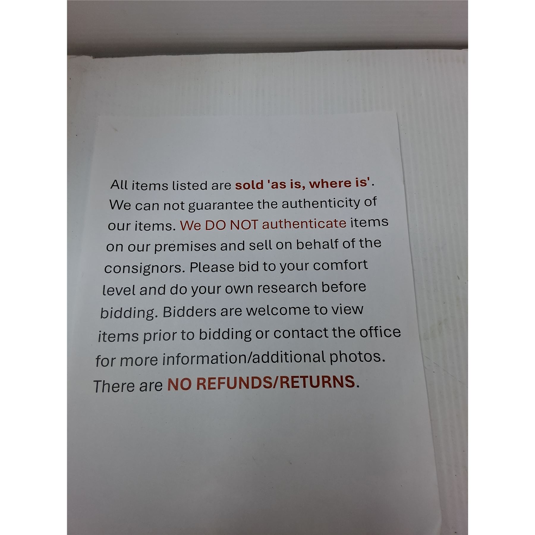 If you are wanting to hold on items for another auction coming up, let us know within 24 hours (maximum hold: 2 auctions). Please give 15 to 30 days for items to be collected, packed, payment processed and shipped out.
