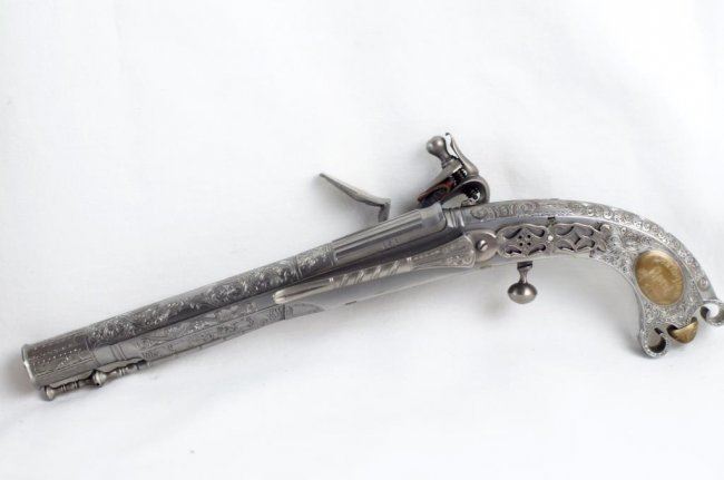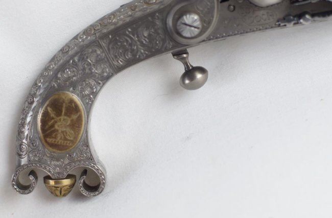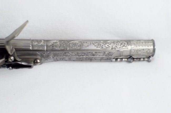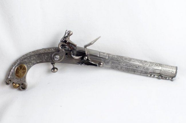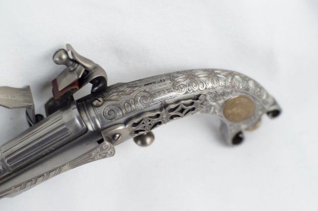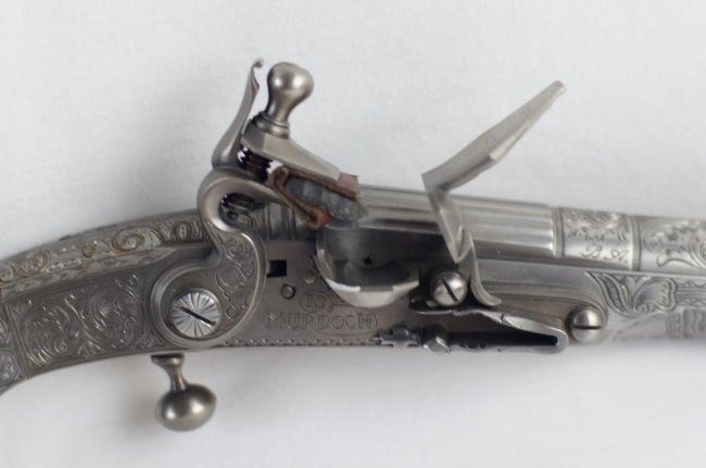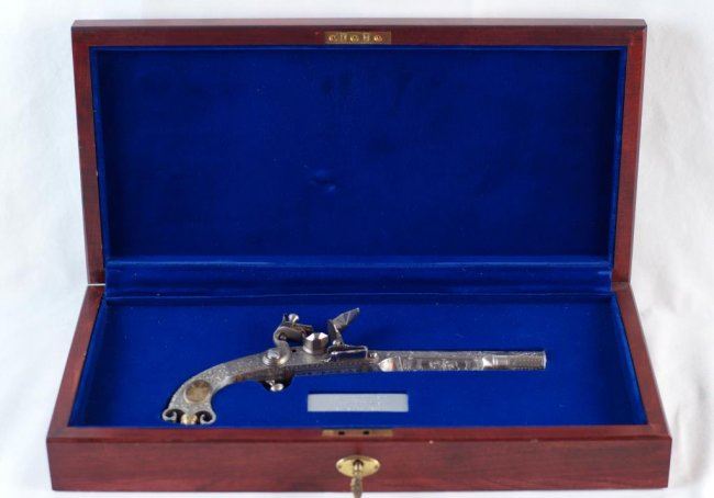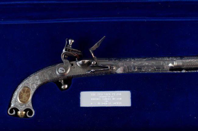Cased Reproduction of the "Pitcairn Pistol, the gun that fired the shot that was heard round the world!". The reproduction of the all steel and silver Scottish Murdoch ram's horn butt flintlock pistol used by British Major Pitcairn whom historians believe fired the first shot of the American Revolutionary War from the Green at Lexington. .60 caliber, 7 1/2-inch barrel, floral scroll engraved with fluted breech. Floral scroll engraved frame and grip with ball trigger. Belt hook. Left side of grip with oval brass escutcheon with commemorative legend: Lexington/April 12, 1775. Right side with brass escutcheon with Pitcairn family crest. Contained in blue velour-lined factory walnut display case. Limited edition of 900 made by the Whitney Armory for the US Historical Society