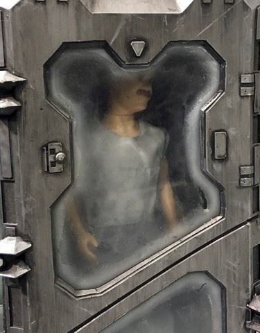 This screen used Cryo Locker was one of the hero filming miniatures ripped out of the cargo container in the crash of the Merchant Vessel Hunter Gratzner in the opening crash sequence in the film Pitch Black (2000). Each fiberglass and epoxy miniatures was rigged with pneumatically actuated pull cables that launched each Cryo Locker out of the cargo container at the point of the spaceship's impact. Cryo Locker includes a puppet. 20" tall x 11" wide. 1:6 ratio. This incredible, handmade miniature is from the celebrated collection of Academy Award winning New Deal Studios. New Deal Studios is a 21st Century Media Studio, unlike any in the world. A full-service film production and visual effects studio, with over 20 years of iconic imagery, New Deal Studios develops, designs, prototypes, and creates all types of high caliber media projects. Founded in 1995 by Matthew Gratzner, Ian Hunter and Shannon Blake Gans, this artist owned and operated independent studio, born in the heyday of visual effects, has truly evolved into the technology driven studio for the future, consistently delivering the perfect marriage of artistry and technology. Award winning credits by New Deal Studios include high-profile projects such as Dark Knight Rises, Hugo, The Avengers, Oz the Great and Powerful, Iron Man, The Dark Knight, Watchmen, I am Legend, Night at the Museum, Whiteout, 2012, Alice in Wonderland, Inception, Battleship and Interstellar.