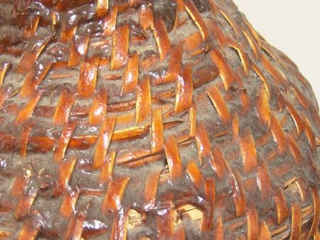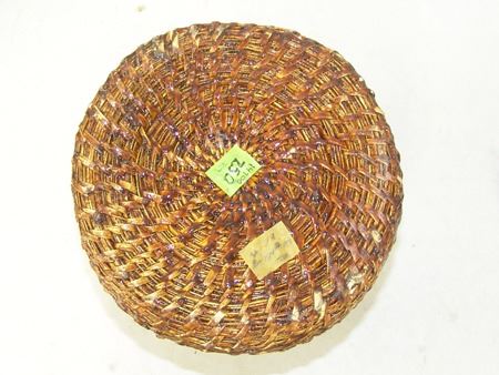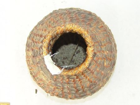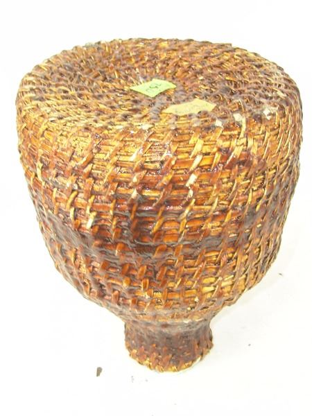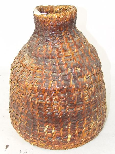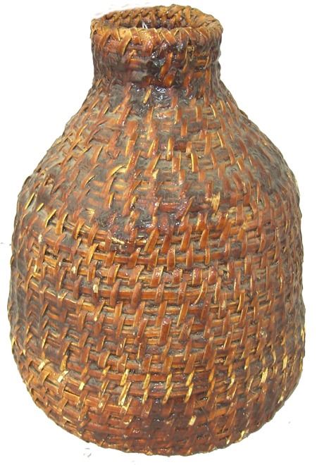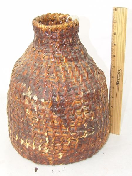 Mid/Late 1900s, Traditional pitch-covered olla shaped "tus" for carrying water, probably Apache. Marked on bottom, "Nellie Blake." Very good condition. 11-1/2" x 9"