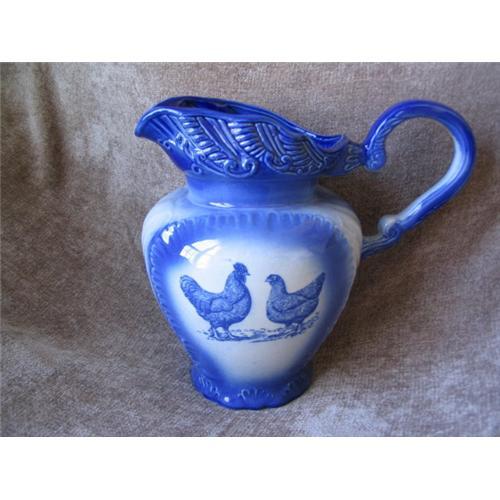 Gorgeous old blue transferware water pitcher. I'm guessing circa 1900 but it could be older. Most likely at one time there was a basin to accompany this interesting old find. Blue and white with rooster and hen appearing on the sides and front of the pitcher. Very cuvy handle and nice detail of scrolls along the top rim, along the sides and at the base. Perfect condition, no chips or cracks. Measures 10 inches tall and 11 inches from the edge of the handle to the front of the pitcher.