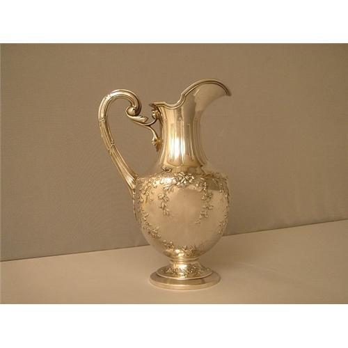 This is the most delightful of Pitchers! It is hand made with alot of detail. The silversmith Cardeilhac is very famous in France. He is known for his quality and design.This is an exceptional piece, it is sterling silver made in about 1890. It is in good condition.