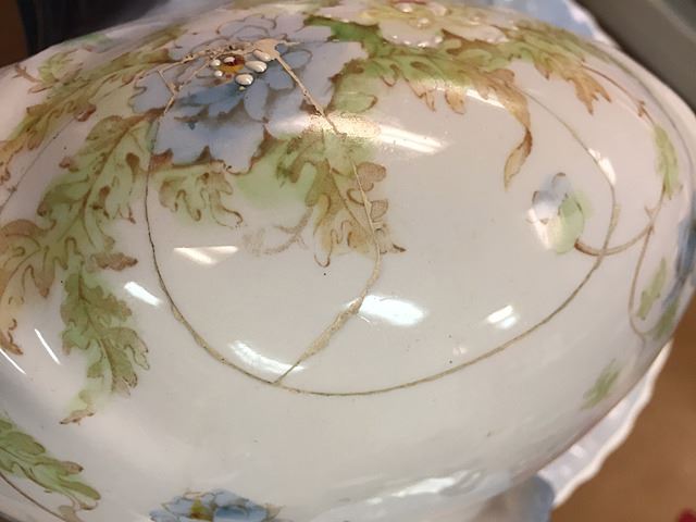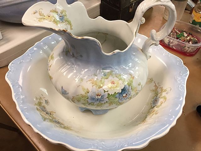 Nice pitcher and bowl set, porcelain white and blue with flowers, country green side/work table.