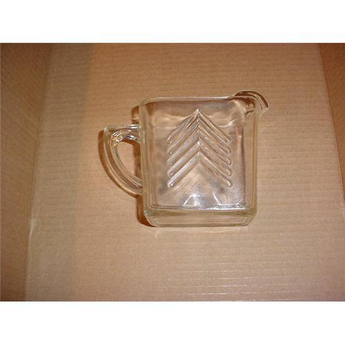 "Chevron" small pitchers were given out by the Chevron stations as gifts whenever you purchased gas from them. This one is made of clear glass, with the Chevron logo on its side. It is in good condition - no chips or hairline cracks.