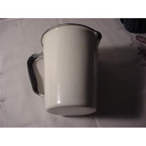 White metal measuring pitcher, with inside measurements. Pitcher has a nice handle to be able to hold heavy amounts. Two areas are chipped as shown in the second picture.