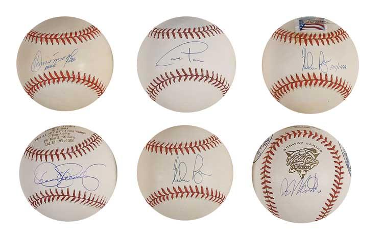 Six official Rawlings baseballs, each signed in ballpoint on the sweet spot or side panel by a Major League pitcher. Signers are Nolan Ryan (2), including one limited edition, Dennis Eckersley, Orlando Hernandez, Carl Pavano, and one other. In fine overall condition. Pre-certified Steve Grad/PSA/DNA and RRAuction COA.