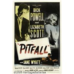 <B>Pitfall (United Artists, 1948)</B></I> One Sheet (27" X 41"). Dick Powell is back with Lizabeth Scott as the moll in this hard hitting <I>film noir</B></I> classic. What a great design for a noir poster with it's B&W images washed in color with the vibrant red accents. This is one of our favorites in the noir market. This poster has had just the most minimal fold line touchup. Very Fine+ on Linen.