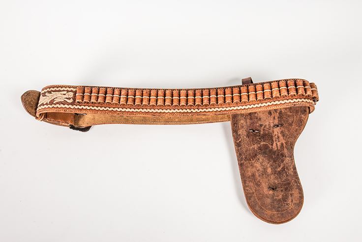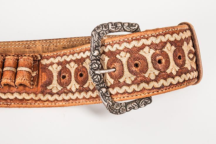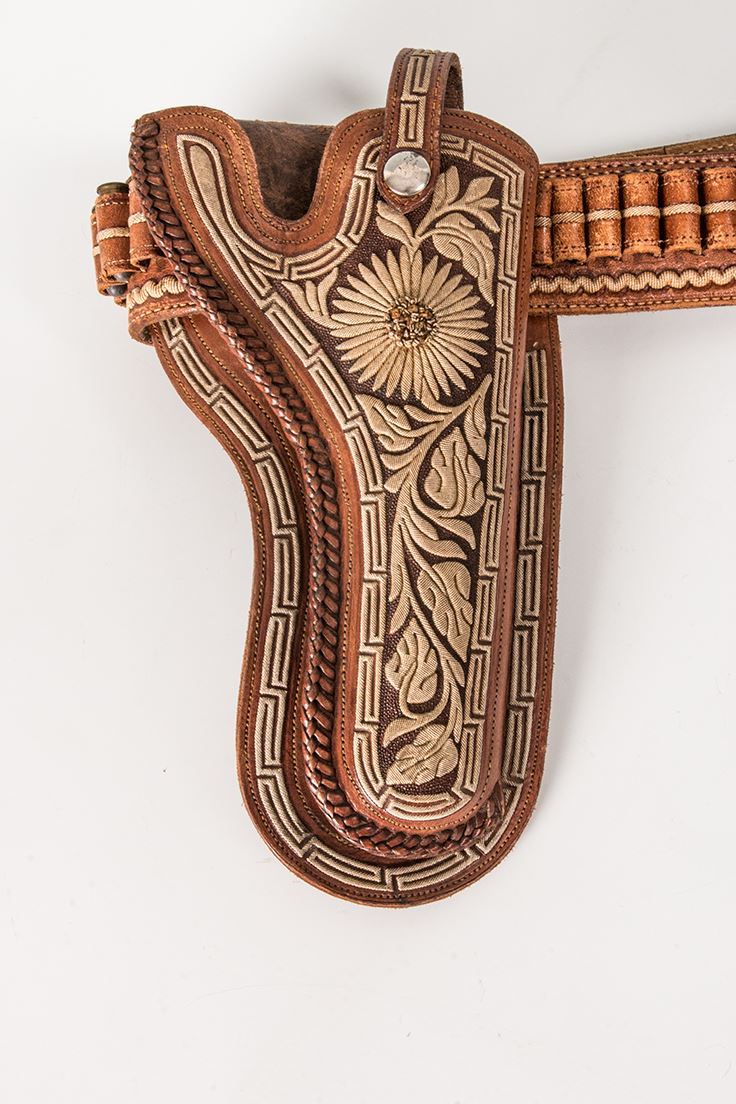 Pitiado Mexican Gun Rig. Belt is 44" long x 2" wide. Holster is 10" long. Fine Pitiado work in geometric and floral designs. Circa 1920's.