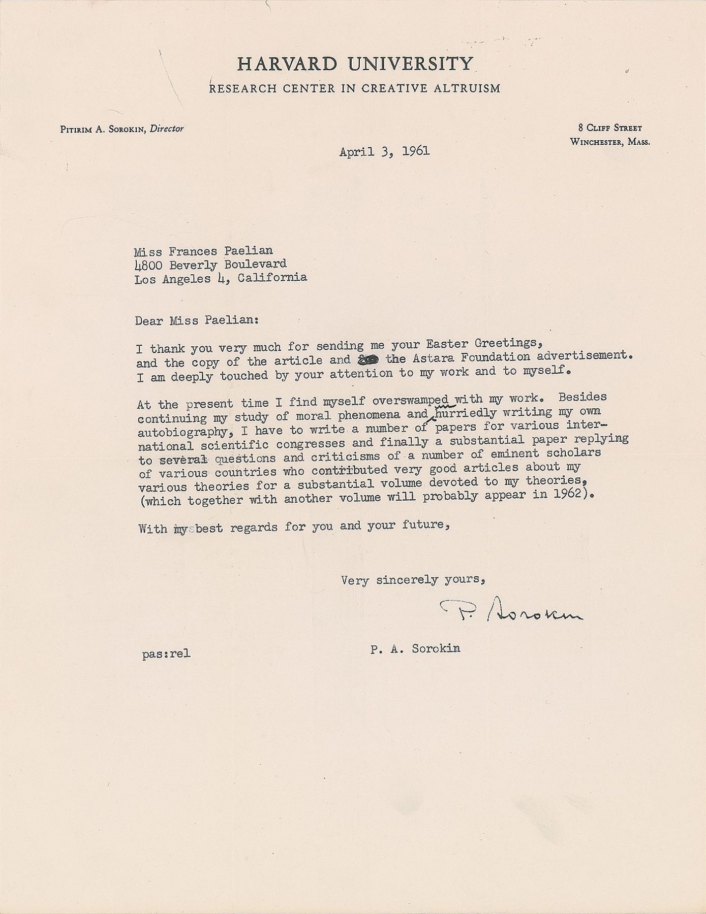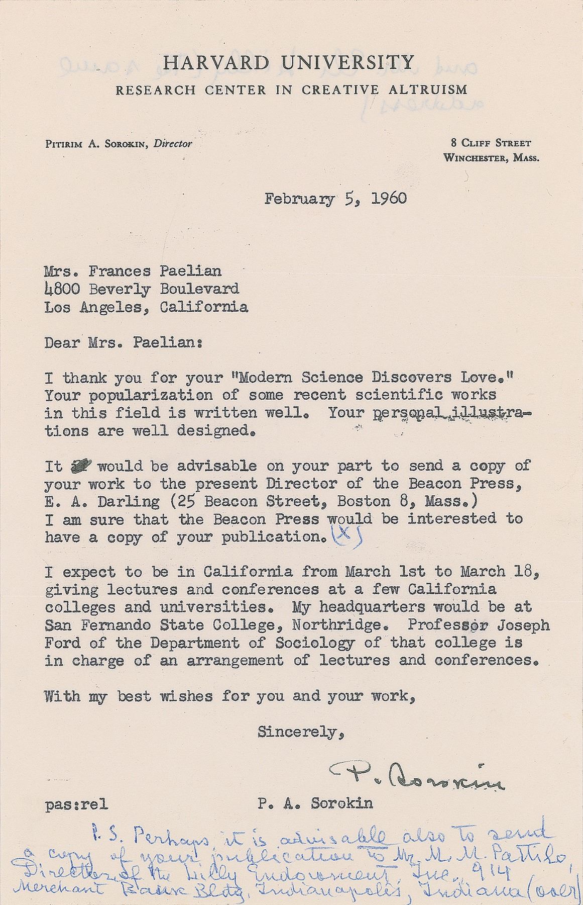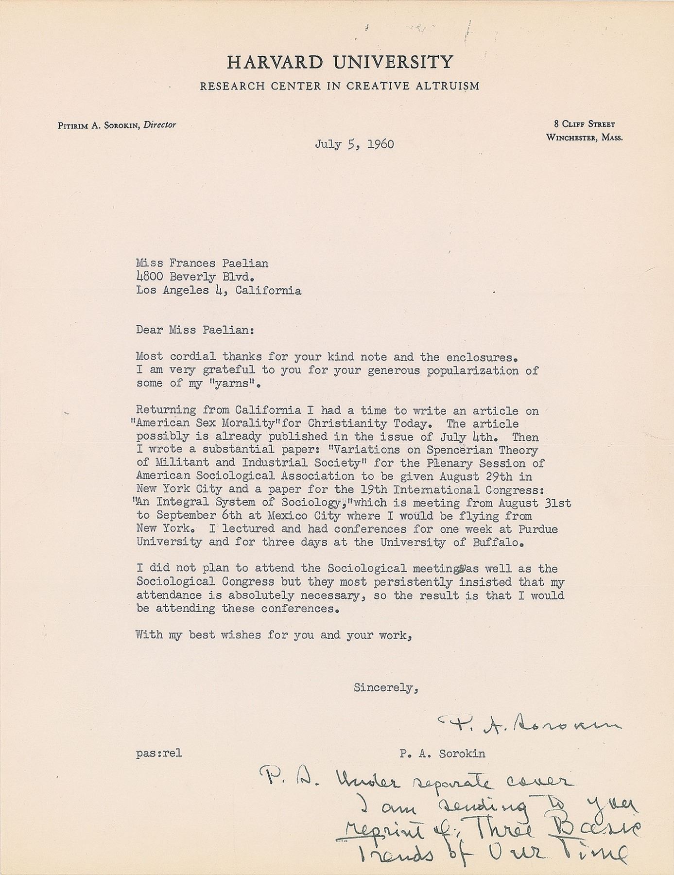 Russian-born American sociologist and political activist (1889–1968) who is best known for his contributions to the social cycle theory. A leader among the Democrats leading up to the Russian revolution, he escaped from the Soviet Union in 1922 and emigrated to the United States, accepting a position at Harvard University and founding its Department of Sociology. Five TLSs, signed “P. A. Sorokin” or “P. Sorokin,” six total pages, 5.5 x 8.5 and 8.5 x 11, dated between February 1960 and April 1961. Each letter is addressed to Miss Frances Paelian and written on Harvard University letterhead. The earliest letter, February 5, 1960: “I thank you for your ‘Modern Science Discovers Love.’ Your popularization of some recent scientific works in this field is written well. Your personal illustrations are well designed…I expect to be in California from March 1st to March 18, giving lectures and conferences at a few California colleges and universities,” with Sorokin adding a handwritten postscript: “Perhaps it is advisable also to send a copy of your publications to Mr. M. M. Pattilo, Director of the Lilly Endowment.” A letter from February 26, 1960, in part: “Yesterday I received a book by a Swedish psychologist Bjorn Sjovall, entitled: Hojdpsyologi (Height–Psychology, in contrast to the Freudian ‘depth–psychology’ which Sjovall, like myself, finds perfectly ‘shallow–psychology’). In this book Dr. Sjovall, like yourself, honors me as the founder and leader of this new ‘Height–Psychology.’” Another, dated July 5, 1960, in part: “Returning from California I had a time to write an article on ‘American Sex Morality’ for Christianity Today. The article possibly is already published in the issue of July 4th. Then I wrote a substantial paper: ‘Variations on Spencerian Theory of Militant and Industrial Society.’” In overall fine condition.