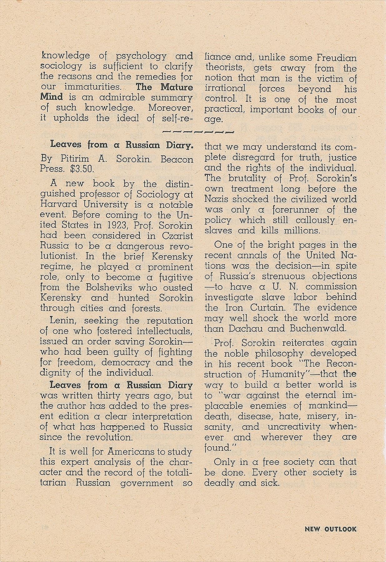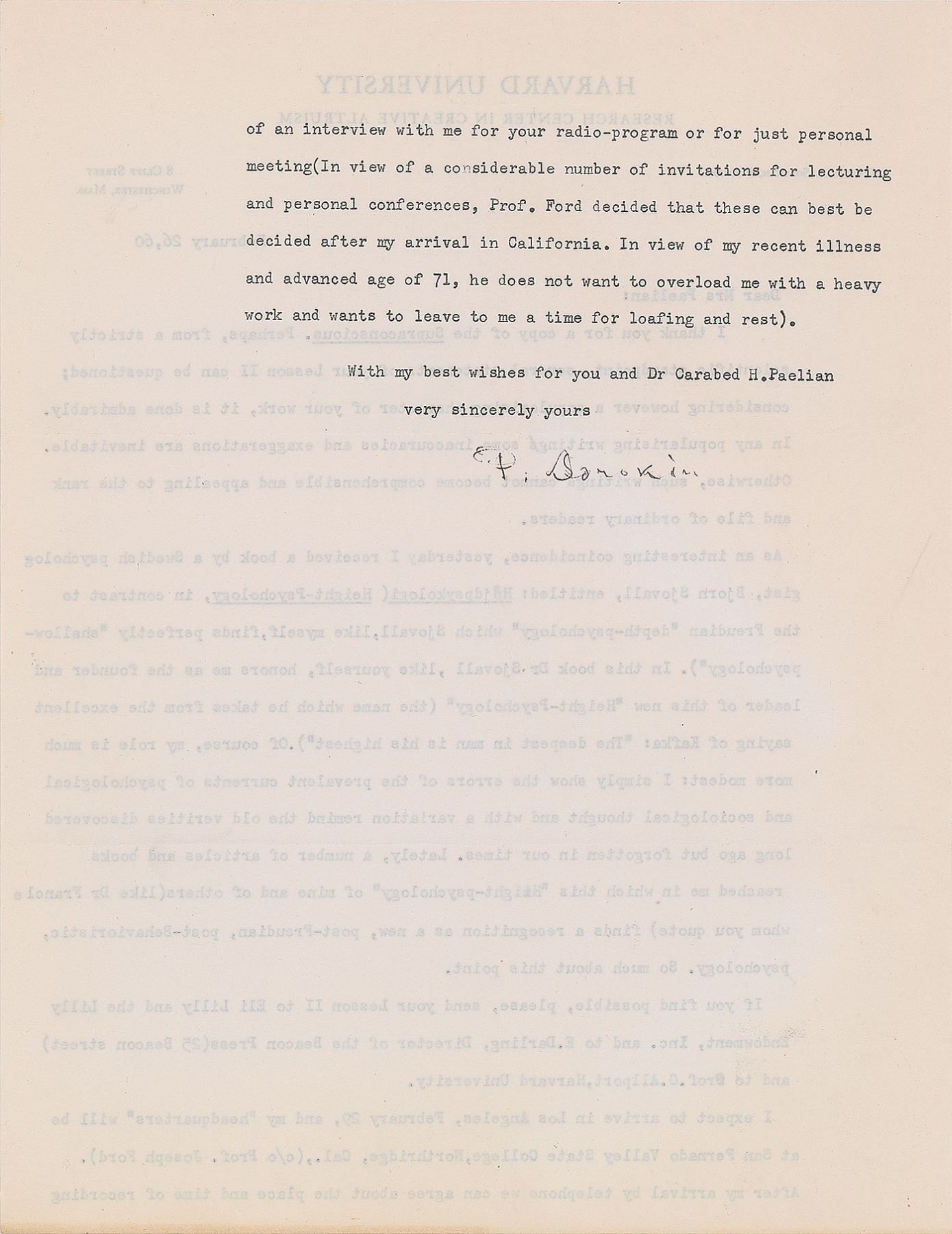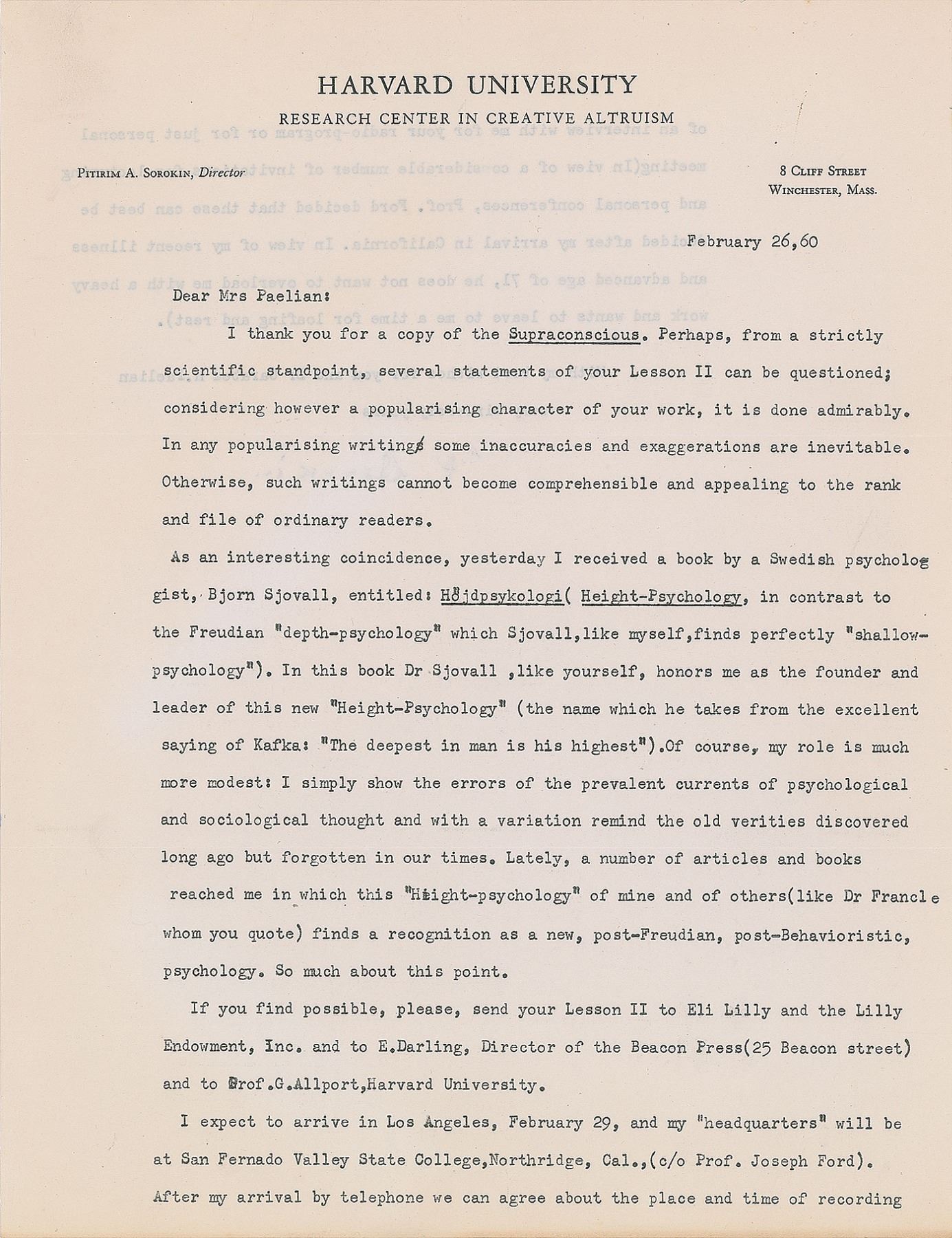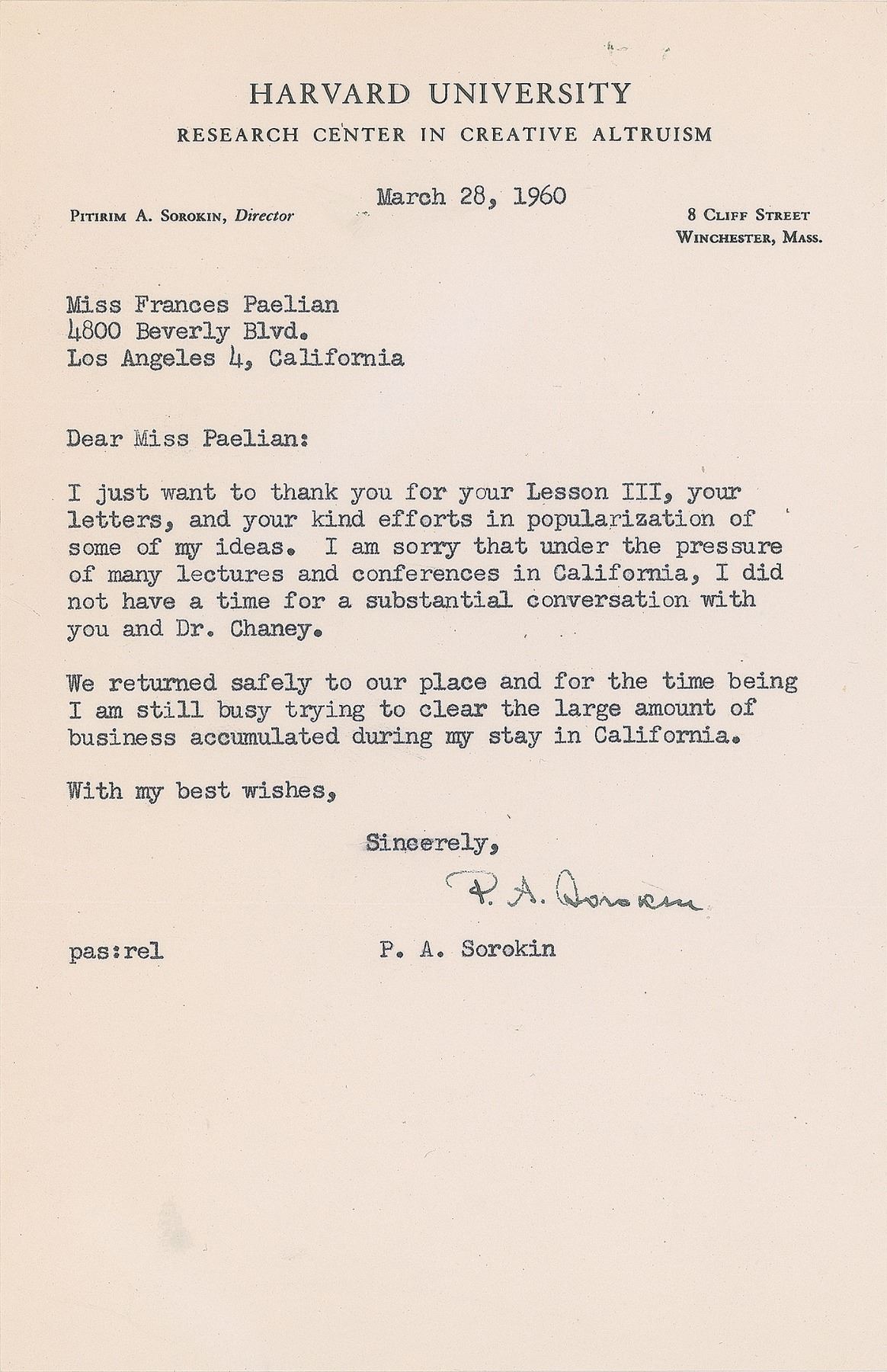 Russian-born American sociologist and political activist (1889–1968) who is best known for his contributions to the social cycle theory. A leader among the Democrats leading up to the Russian revolution, he escaped from the Soviet Union in 1922 and emigrated to the United States, accepting a position at Harvard University and founding its Department of Sociology. Five TLSs, signed “P. A. Sorokin” or “P. Sorokin,” six total pages, 5.5 x 8.5 and 8.5 x 11, dated between February 1960 and April 1961. Each letter is addressed to Miss Frances Paelian and written on Harvard University letterhead. The earliest letter, February 5, 1960: “I thank you for your ‘Modern Science Discovers Love.’ Your popularization of some recent scientific works in this field is written well. Your personal illustrations are well designed…I expect to be in California from March 1st to March 18, giving lectures and conferences at a few California colleges and universities,” with Sorokin adding a handwritten postscript: “Perhaps it is advisable also to send a copy of your publications to Mr. M. M. Pattilo, Director of the Lilly Endowment.” A letter from February 26, 1960, in part: “Yesterday I received a book by a Swedish psychologist Bjorn Sjovall, entitled: Hojdpsyologi (Height–Psychology, in contrast to the Freudian ‘depth–psychology’ which Sjovall, like myself, finds perfectly ‘shallow–psychology’). In this book Dr. Sjovall, like yourself, honors me as the founder and leader of this new ‘Height–Psychology.’” Another, dated July 5, 1960, in part: “Returning from California I had a time to write an article on ‘American Sex Morality’ for Christianity Today. The article possibly is already published in the issue of July 4th. Then I wrote a substantial paper: ‘Variations on Spencerian Theory of Militant and Industrial Society.’” In overall fine condition.