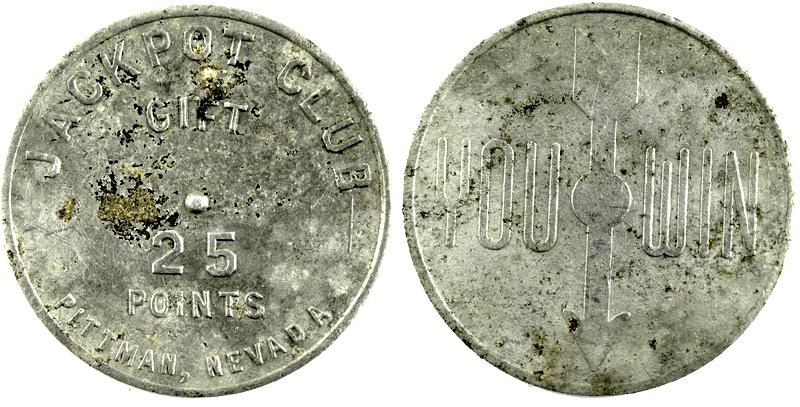 Token reads; Jackpot Club/gift/25/points/Pittman, Nevada//You Win.