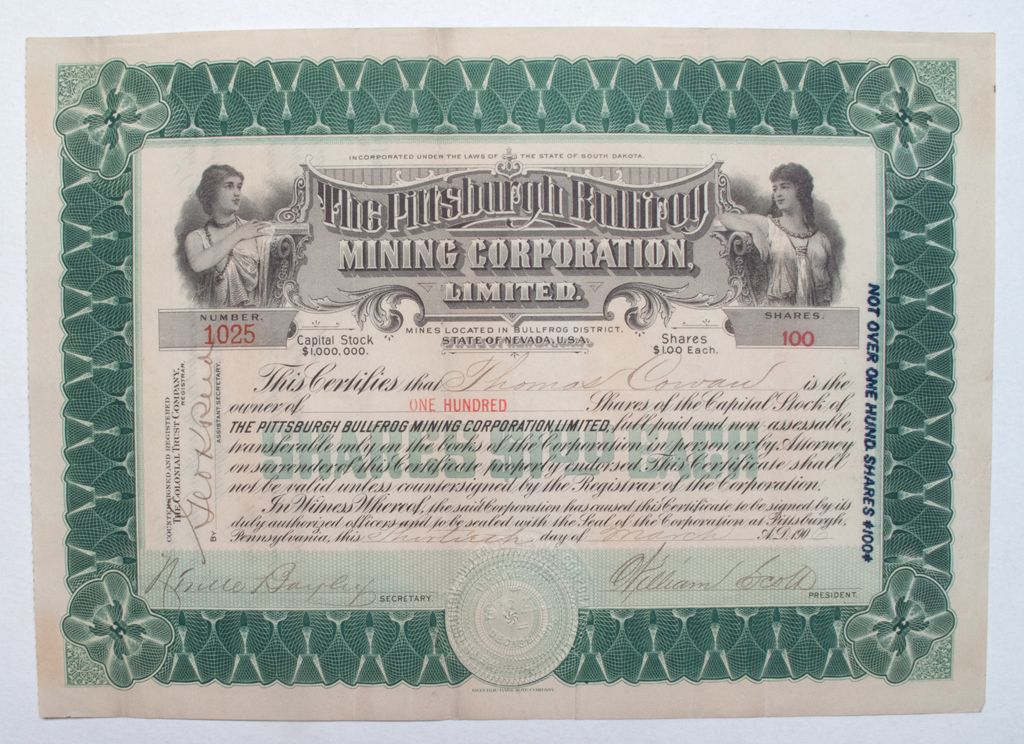 Incorporated in South Dakota. No. 1025 issued March 30, 1906 to Thomas Corvan for 100 shares. Signed by William Scott, President and Neville Bayley, Secretary. Printed by Republic Bank Note Company and is green ink on crème paper; masthead bookended by two ladies. Endorsed on reverse. Located in the Bullfrog district, the mines had 115 acres of unpatented land. [Mines Directory p. 411, Vol. 1, 1910]. Neville Bayley was born in 1863 in England. He emigrated to the United States about 1880 when he was just seventeen and made a fortune: owning two hotels in Pittsburgh, Pennsylvania, and running an amusement park in Connecticut. He was also an officer of the Pittsburgh Bullfrog Mining Company.City: BullfrogCounty: EsmeraldaState: NV