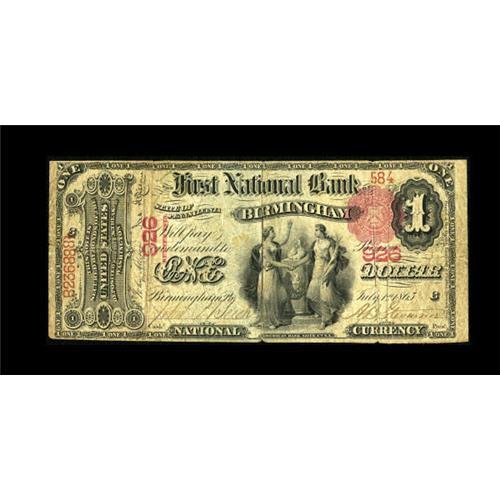 <B>Pittsburgh, PA</B></I> - $1 1875 Fr. 385 <B>The First NB of Birmingham</B></I> Ch. # 926<BR> The paper has a lot of life, though there are some minor splits. The signatures remain strong and the overall appearance is excellent. The last appearance of an ace from this bank was four years ago. <B>Fine</B></I>.<BR><BR><b>Shipping:</b> Coins & Currency (<a target="_blank" href="http://www.heritageauctions.com/common/shipping.php">view shipping information</a>)
