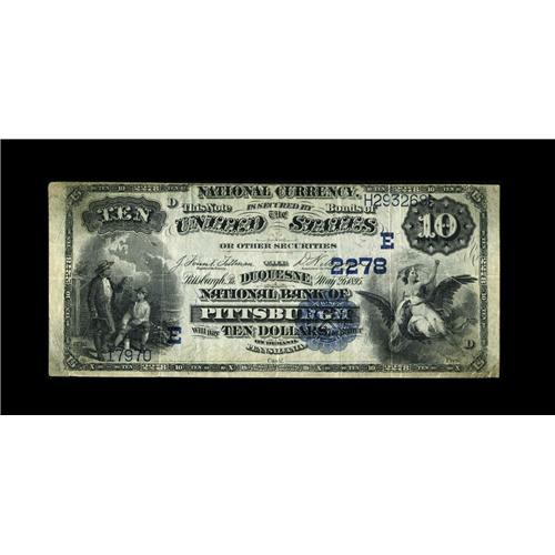 <B>Pittsburgh, PA</B></I> - $10 1882 Date Back Fr. 542 <B>The Duquesne NB</B></I> Ch. # (E)2278<BR>A less available type and denomination from a prolific big city issuer. An ideal note for type. <B>Very Fine,</B></I> with some staining at the corners.