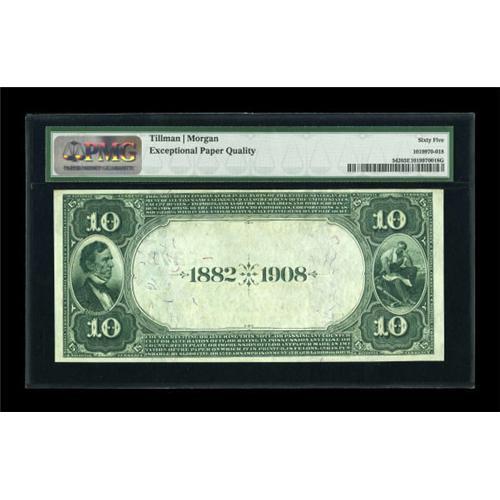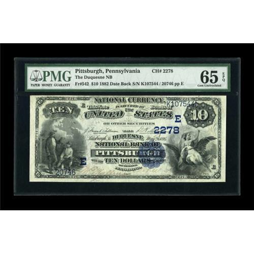 <B>Pittsburgh, PA</B></I> - $10 1882 Date Back Fr. 542 <B>The Duquesne NB</B></I> Ch. # (E)2278<BR> Solid margins are noted on this well embossed issue. The overall eye appeal is certainly worthy of the grade and the Exceptional Paper Quality moniker bestowed upon it by PMG. <B>PMG Gem Uncirculated 65 EPQ.</B></I><BR><BR><b>Shipping:</b> Coins & Currency (<a target="_blank" href="http://www.heritageauctions.com/common/shipping.php">view shipping information</a>)