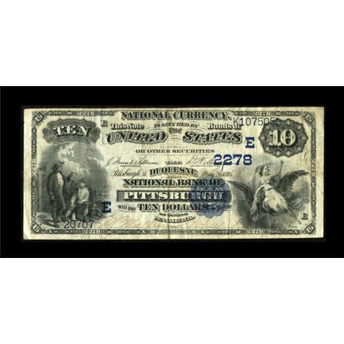 <B>Pittsburgh, PA</B></I> - $10 1882 Date Back Fr. 542 <B>The Duquesne NB</B></I> Ch. # (E)2278<BR> A less available type and denomination from a prolific big city issuer. An ideal note for type. <B>Very Fine</B></I>, with signatures still visible.<BR><BR><b>Shipping:</b> Coins & Currency (<a target="_blank" href="http://www.heritageauctions.com/common/shipping.php">view shipping information</a>)