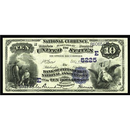 <B>Pittsburgh, PA</B></I> - $10 1882 Date Back Fr. 545 <B>The Bank of Pittsburgh, National Assoc</B></I> Ch. # (E)5225<BR>Big city Nationals can easily be underrated. This lovely <B>Extremely Fine</B></I> example is a case in point. The census from here now stands at a seemingly ample 113 large notes with the addition of this crackling fresh and beautifully margined example. Despite the seeming availability of the issuer, this is one of only five $10 1882 Date Backs from here confirmed as surviving redemption and destruction.