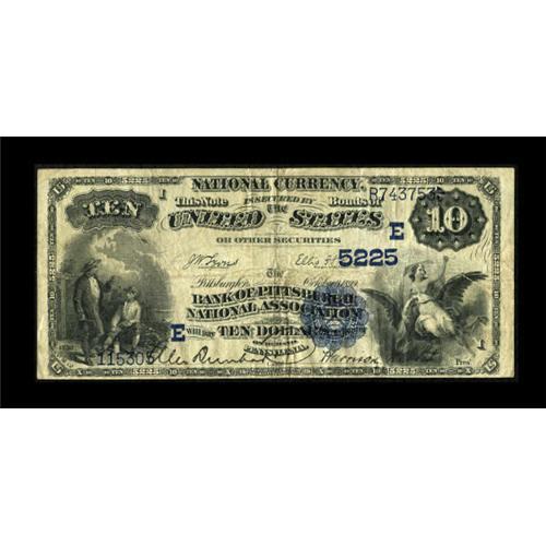 <B>Pittsburgh, PA</B></I> - $10 1882 Date Back Fr. 545 <B>The Bank of Pittsburgh, National Assoc</B></I> Ch. # (E)5225<BR> A newly reported example that is now one of only six $10 1882 Date Backs from here confirmed as surviving redemption and destruction. Relatively a scarce issue given the fact that most large size known from here are 1902 issues. <B>Fine+</B></I> with no problems noticed.<BR><BR><b>Shipping:</b> Coins & Currency (<a target="_blank" href="http://www.heritageauctions.com/common/shipping.php">view shipping information</a>)