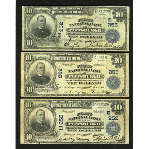 <B>Pittsburgh, PA</B></I> - $10 1902 Plain Back Fr. 632 <B>The First NB</B></I> Ch. # (E)252 (2)<BR><B>Pittsburgh, PA</B></I> - $10 1902 Plain Back Fr. 632 <B>The First NB</B></I> Ch. # 252<BR> A trio of <B>Very Good+</B></I> notes each displaying different signature varieties.<BR><BR><b>Shipping:</b> Coins & Currency (<a target="_blank" href="http://www.heritageauctions.com/common/shipping.php">view shipping information</a>)