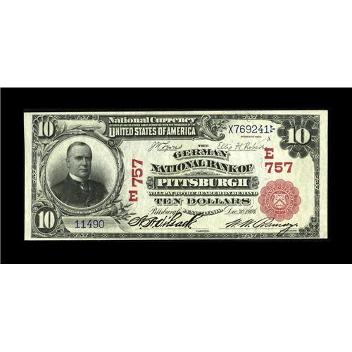 <B>Pittsburgh, PA</B></I> - $10 1902 Red Seal Fr. 613 <B>The German NB</B></I> Ch. # (E)757<BR>This note last appeared at auction more than a decade ago and realized a sizeable sum for the time, $1,210. A lone center bend is noted but the originality of the paper and fire engine red overprint carry the overall eye appeal. <B>Choice About Uncirculated.</B></I><BR><I>From The Bill and Kathy Stella Currency Collection</B></I><BR><BR><b>Shipping:</b> Coin/Currency (<a target="_blank" href="http://www.heritageauctions.com/common/shipping.php">view shipping information</a>)