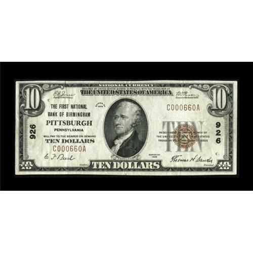 <B>Pittsburgh, PA</B></I> - $10 1929 Ty. 1 <B>The First NB of Birmingham</B></I> Ch. # 926<BR> A very rare bank, especially in small size, where just five notes are listed in the Kelly census. <B>Very Fine-Extremely Fine</B></I>.<BR><BR><b>Shipping:</b> Coins & Currency (<a target="_blank" href="http://www.heritageauctions.com/common/shipping.php">view shipping information</a>)