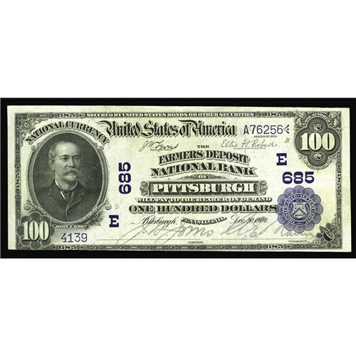 <B>Pittsburgh, PA</B></I> - $100 1902 Date Back Fr. 689 <B>The Farmers Deposit NB </B></I> Ch. # 685<BR>While hardly a rare bank, nice high denomination examples from here are very seldom offered. This bright piece with a deep blue overprint is certain to please. <B>Very Fine-Extremely Fine,</B></I> with a closely trimmed bottom margin which barely nicks the design on the left side of the note.