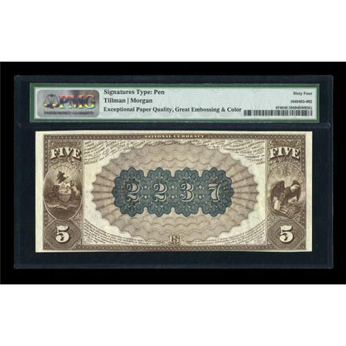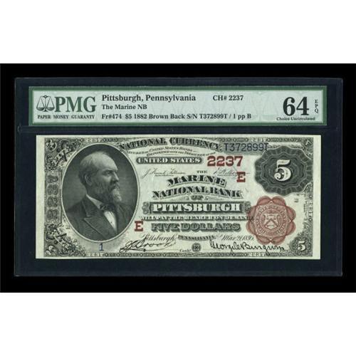 <B>Pittsburgh, PA</B></I> - $5 1882 Brown Back Fr. 474 <B>The Marine NB</B></I> Ch. # (E)2237<BR> This wonderful note made its first public appearance in our Central States Sale last year and we quote liberally from that catalog description: "This 1-B note is the only serial number 1 known on this bank and only the third known serial number 1 Brown Back for all of the Pittsburgh banks combined. George C. Burgwin was a prominent lawyer who appeared regularly before state and federal courts, including the US Supreme Court. In 1891 he also became a director of the Marine National Bank. This led to him becoming vice president in 1900 and president in 1903. He would stay at that post for over twenty years until his death on April 18, 1925. Along the way Mr. Burgwin was also involved in many civic, fraternal, and social organizations. This $5 is third-party graded <B>PMG Choice Uncirculated 64 EPQ</B></I> with the added comments of "exceptional paper quality, great embossing & color." We see that as certainly the case as this original note has been well preserved over the years. The inks are dark and the paper is white. The penned signatures of J.S. Brooks and George C. Burgwin look like they were laid down earlier today with ink from an ink well. The only thing that keeps this note from climbing higher on the grading scale is the thin bottom margin. This is still a true trophy note worthy of the finest collection."<BR><BR><b>Shipping:</b> Coins & Currency (<a target="_blank" href="http://www.heritageauctions.com/common/shipping.php">view shipping information</a>)