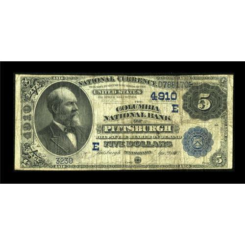 <B>Pittsburgh, PA</B></I> - $5 1882 Date Back Fr. 533 <B>The Columbia NB</B></I> Ch. # (E)4910<BR> A scarce Pittsburgh bank which issued large notes only, This becomes only the second $5 Date Back known from here. Pleasing <B>Very Good-Fine</B></I>.<BR><BR><b>Shipping:</b> Coins & Currency (<a target="_blank" href="http://www.heritageauctions.com/common/shipping.php">view shipping information</a>)