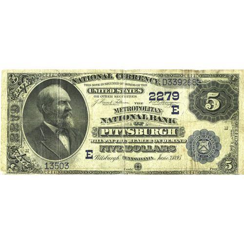 <B>Pittsburgh, PA</B></I> - $5 1882 Date Back Fr. 534 <B>The Metropolitan NB</B></I> Ch. # (E)2279<BR>Large only from this institution in Steel City. The note is complete, retains vivid hues, and the signatures which are faded are visible to a degree. <B>Very Good+.</B></I>