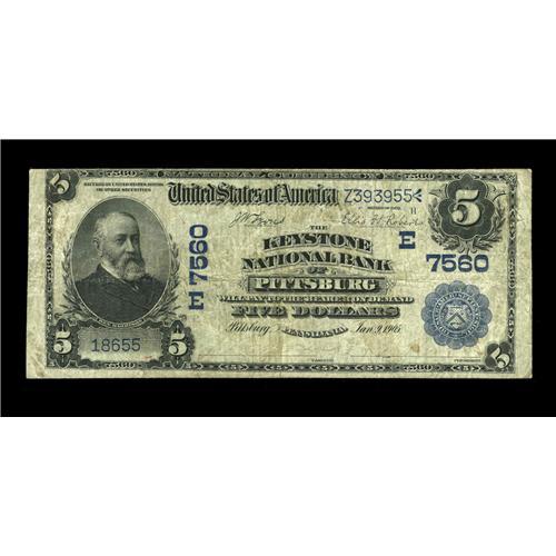 <B>Pittsburgh, PA</B></I> - $5 1902 Date Back Fr. 590 <B>The Keystone NB </B></I> Ch. # (E)7560<BR>An elusive Pittsburgh issuer that closed its doors in 1934 after issuing only Third Charter designs. The signatures are quite faint, but only two pinholes are detected. A challenging big city note. <B>Fine.</B></I>