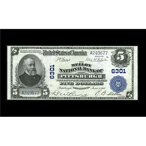 <B>Pittsburgh, PA</B></I> - $5 1902 Plain Back Fr. 598 <B>The Mellon NB </B></I> Ch. # 6301<BR>A bright $5 Plain Back for type with Gem paper surfaces that are as fresh and crisp as the day this note was printed. <B>Choice Crisp Uncirculated</B></I> rather than the higher grade due to the lower margin not quite being up to our Gem standards.