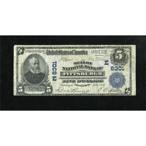<B>Pittsburgh, PA</B></I> - $5 1902 Plain Back Fr. 598 <B>The Mellon NB</B></I> Ch. # (E)6301<BR> Engraved signatures of Lewis and Mellon grace this still bright note. <B>Very Good-Fine</B></I>.<BR><BR><b>Shipping:</b> Coins & Currency (<a target="_blank" href="http://www.heritageauctions.com/common/shipping.php">view shipping information</a>)